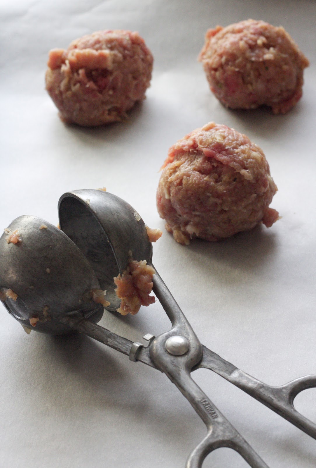 (a stocking stuffer from years ago that I was surprised I still had in my utensil drawer!) that made shaping the meatballs in uniform size a lot easier and less messy.